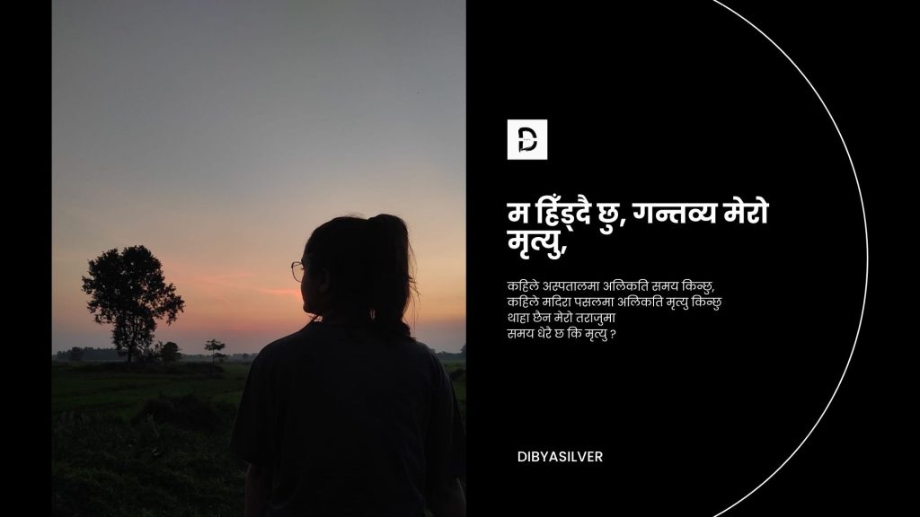 म हिँड्दै छु, गन्तव्य मेरो मृत्यु, मृत्युबाट भाग्दै, कहिले लुक्दै कहिले लड्दै म हिँड्दै छु, मृत्युलाई भेट्न भ्रममा छु, ठुलो भ्रममा कहिले अस्पतालमा अलिकति समय किन्छु, कहिले मदिरा पसलमा अलिकति मृत्यु किन्छु थाहा छैन मेरो तराजुमा समय धेरै छ कि मृत्यु ? तर मलाई थाहा छ म हिँड्दै छु, गन्तव्य मेरो मृत्यु यो गन्तव्य मैले रोजेको होइन आमाको गर्भ देखी निर्धारित नै छ मेरो मात्र होइन, तिम्रो, तिम्रो अनि तिम्रो  अनि हामी सबैको गन्तव्य निश्चित छ । । ।